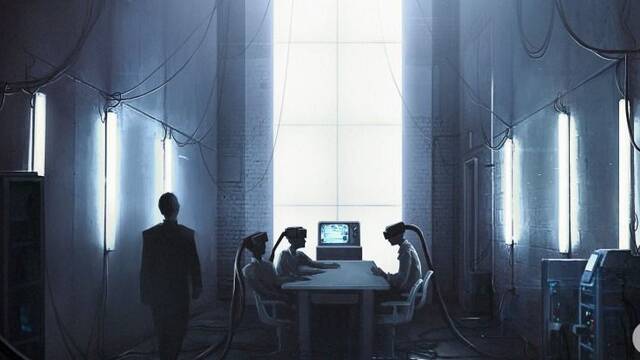 En ella podemos ver a tres personas aparentemente absorbidas por estos dispositivos en una lúgubre habitación, bajo la supervisión de una cuarta.