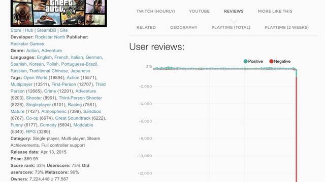 La petición en línea de Change.org lleva ya 40.000 firmas de usuarios que se oponen a las medidas tomadas por la compañía, pero, sin duda, lo que más puede captar la atención de Take-Two es cómo ha cambiado la puntuación del juego entre los aficionados en Steam, como evidencia esta gráfica de SteamSpy: