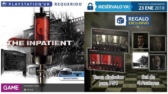 GAME ha detallado sus incentivos por reserva para The Inpatient, el videojuego de realidad virtual en PlayStation 4 que nos contará una tétrica y atmosférica historia. El juego, que llegará el próximo 24 de enero en exclusiva a la consola de Sony, ofrecerá como regalo exclusivo un tema dinámico para PlayStation 4 y un set de 4 avatares para nuestro perfil.