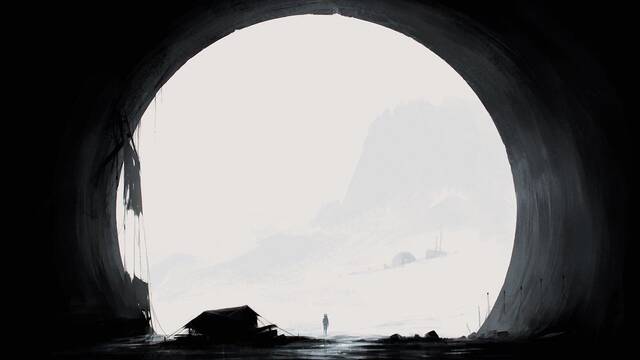 La ilustración muestra la salida de un túnel que da a una montaña nevada. Dentro hay lo que parece un campamento.