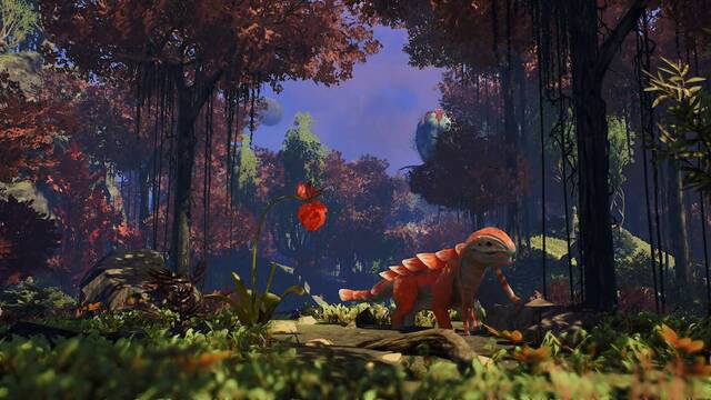 Muestra un mundo aparentemente alieníegna con extraña vegetación y una especie de lagarto.