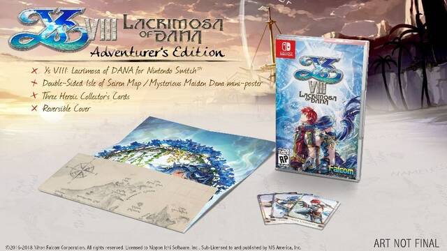 La edición de Switch ofrecerá en su lanzamiento comercial la Day One Adventurer's Edition, que presentará una edición con portada reversible, un pack de tres cartas foil basadas en Adol, Dana y Dogi y un póster a doble cara que representará el mapa del juego y a la propia Dana.