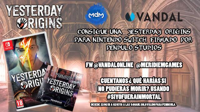 Gana con nosotros y @MeridiemGames esta edición única de Yesterday Origins para Switch. RT + Follow @VandalOnline y @MeridienGames y dinos que harías #SiYoFueraInmortal pic.twitter.com/7WX9DCZXyD— Vandal (@VandalOnline) 22 de junio de 2018