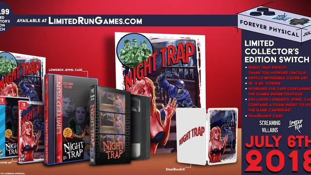 Night Trap: 25th Anniversary Edition no tiene fecha de lanzamiento oficial en Switch, PS4 o Xbox One, pero Limited Run Games ha fechado esta versión para el próximo 6 de julio en la máquina de Nintendo. La presentación inmejorable de este juego de culto incluirá una copia del juego, un carátula reversible con la ilustración original del juego de SEGA CD, un VHS con todas las secuencias del juego, un póster de 18x24, una caja de plástico en imitación de las carátulas de la época con plástico transparente y una caja Steelbook de diseño exclusivo. Todo ello por 69,99 dólares. La tenéis disponible aquí.