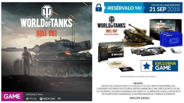 GAME ha anunciado la venta en exclusiva de la Edición Coleccionista de World of Tanks, que además de numeroso contenido exclusivo digital, presenta en formato físico una serie de extras y una réplica de un tanque Tiger 131. Disponible el 21 de septiembre para Xbox One y PS4, esta nueva edición de World of Tanks ya puede reservarse en web o en tienda.