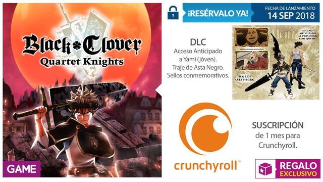GAME ha anunciado sus contenido por reserva para el nuevo videojuego basado en el manga homónimo, Black Clover: Quartet Knights. La cadena de tiendas ha comunicado los extras que recibiremos por reservar el título en sus tiendas, que llegará el próximo 14 de septiembre a PlayStation 4 -además de a PC-.