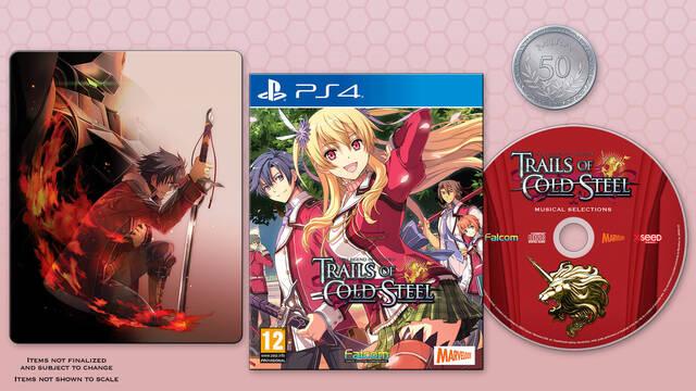 The Legend of Heroes: Trails of Cold Steel Decisive Edition incluye el juego, una moneda, una selección musical y una caja metálica; The Legend of Heroes: Trails of Cold Steel II Relentless Edition el mismo tipo de contenido, pero sustituye la moneda por un emblema de Ouroboros.