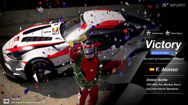 "Alonso se ha impuesto al resto de sus compañeros de equipo (Mike Conway, Kamui Kobayashi, José Maria López, Sebastian Buemi y Kazuki Nakajima) en dos carreras que han transcurrido en el circuito de Le Mans y en el Fuji Speedway, el último de los trazados que ha incluido Gran Turismo Sport", ha dicho Sony.
