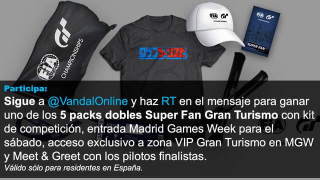 ¡RT + Follow! ¡Gana con nosotros 5 packs dobles Super Fan Gran Turismo y ve a la final de la Madrid Games Week! https://t.co/4BECkdnZkL pic.twitter.com/9i3DE7SRu9— Vandal (@VandalOnline) 18 de octubre de 2018