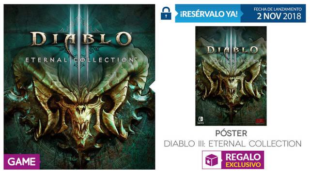 GAME ha anunciado su contenido e incentivo por reserva exclusivo para Diablo III Eternal Collection en Nintendo Switch, la edición del videojuego que incluirá todos los descargables y elementos lanzados para el título de Blizzard hasta la fecha, así como nuevos DLC inspirados en The Legend of Zelda. La cadena de tiendas nos obsequiará con un póster especial con motivo del juego.