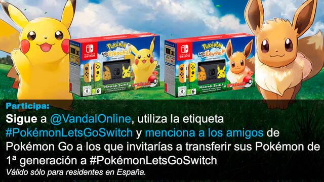 Para celebrarlo, Nintendo propone a todos los seguidores de nuestra cuenta en Twitter, @VandalOnline, comentar con el hashtag #PokémonLetsGoSwitch mencionando (poniendo sus nombres de usuario en Twitter con una @ de lante) a tres amigos a los que invitarían a transferir sus Pokémon de 1ª generación a #PokémonLetsGoSwitch, además de mencionar a nuestra cuenta @VandalOnline, de la que debes ser seguidor.