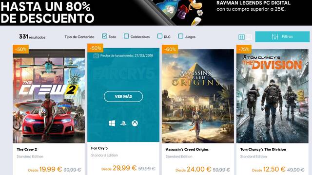 Otros, como Assassin's Creeds Origins tienen un 60%. También es posible encontrar juegos con un 70% o más de descuento, como Watch Dogs 2, Anno 2205.