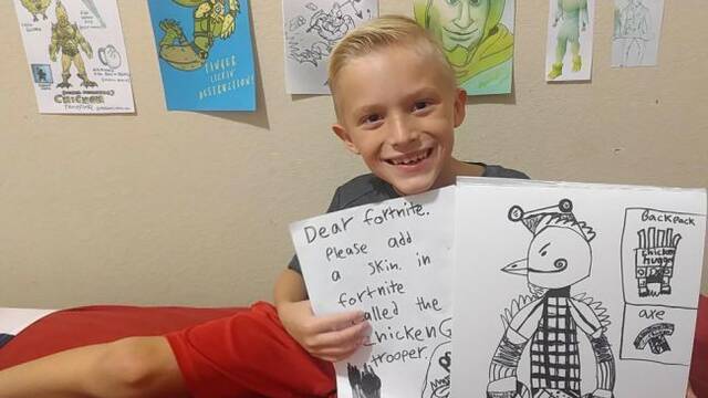 El jugador tfoust10 compartió en Reddit hace unos meses el dibujo de su hijo Connor, de 8 años. Titulado The Chicken Trooper, se trataba de una sugerencia para una skin de Fortnite Battle Royale.