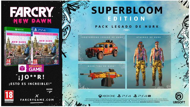 GAME ha anunciado el contenido por reserva y su edición exclusiva para Far Cry: New Dawn, la nueva entrega de Far Cry que llegará a PlayStation 4 y Xbox One el 15 de febrero. La llamada Superbloom Edition tendrá una carátula especial y el pack El Legado de Hurk