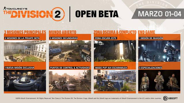 Ubisoft ha detallado el contenido de la beta abierta de Tom Clancy's The Division 2, la secuela del MMO de acción. El videojuego, que llegará el 15 de marzo, contará con un periodo de pruebas abierto y gratuito para todos el próximo fin de semana. De esta manera, del 1 al 4 de marzo, tendemos una nueva oportunidad de disfrutar de su propuesta.