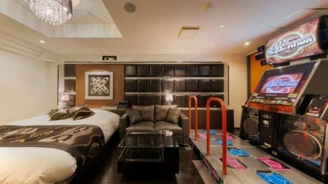 La habitación puede alquilarse por dos horas (58 euros) o por un fin de semana completo (67 euros) y nos presenta, además de una serie de comodidades lógicas -cama extra grande, amplios armarios, un pequeño cine en casa con proyecto incluido-, una máquina recreativa del famoso videojuego de baile. Es una de las habitaciones de lujo del hotel, que entre su oferta, también cuenta una pequeña estancia con una máquina arcade de Taiko no Tatsujin, el curioso juego de percusión con tambores.