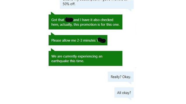 El usuario de Reddit antde5 compartió la imagen del momento en el que el asistente le pedía esperar unos minutos. "Estamos sufriendo un terremoto", escribió el soporte de Xbox. "Por favor, deme 2-3 minutos".