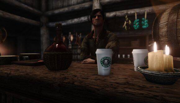 Mysterious Coffee Cup es menos predominante que Skyland Coffee que rellena toda Skyrim de vasos de plástico de la conocida franquicia. Teniendo en cuenta el clima de este videojuego de rol, quizás no les venga mal.