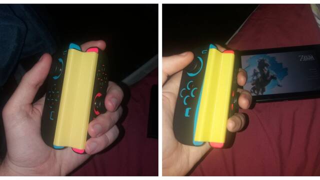 Para hacerse con este genuino adaptador, Ignacio ha utilizado una impresora 3D. Tal y como se aprecia en las imágenes, la pieza se ocupa de unir los dos Joy-Con necesarios para jugar, de manera que todos los botones quedan al alcance de los dedos de una sola mano.