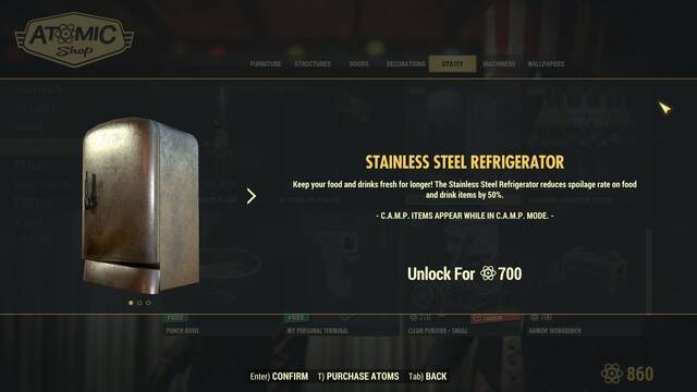 Ni la Estación de Colectrón ni la Nevera pueden obtenerse en el juego sin pagar. Además, la nevera fue un objeto sugerido por la propia comunidad del juego en el subreddit dedicado a Fallout 76.