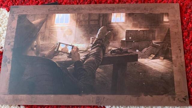 El equipo del juego ha mandado una postal con una imagen del juego en la que el personaje tiene los pies sobre la mesa y está jugando con una consola Nintendo Switch; viste calzado deportivo y lleva auriculares.