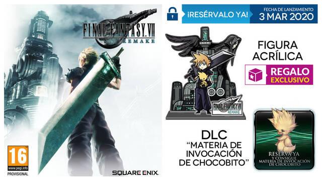 La cadena de tiendas GAME quiere que nos adentremos en las calles de Midgar como es debido: Final Fantasy VII Remake debutará el 3 de marzo de 2020 en PS4, y desde GAME han presentado los regalos que recibirán los usuarios por la reserva del juego: una figura acrílica de Cloud y el DLC Materia de invocación de Chocobito. La versión estándar del juego tiene un precio de 69,95 € en PS4. Además, también han detallado el contenido de la Edición Deluxe del juego, por un precio de 89,95 €.