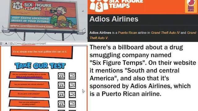 Si visitamos la web de esa compañía dentro del juego nos encontramos con una empresa de negocios turbios (se especializa en el tráfico de drogas) que actúa en zonas de Centroamérica y Sudamérica. Hay más: cuenta con la esponsorización de Adios Airlines, y esa compañía, en el mundo del juego, tiene su sede en Puerto Rico.