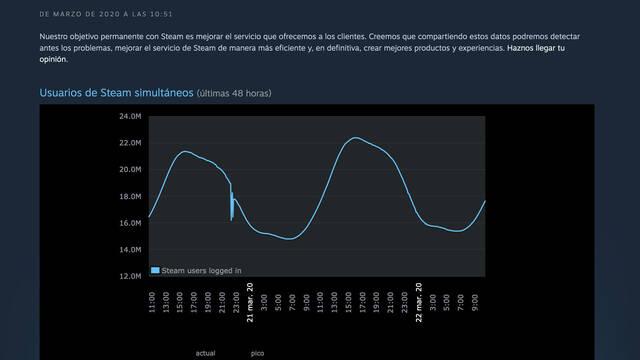 Steam sigue marcando hitos y ha logrado superar los 22 millones de jugadores simultáneos con un pico de un total de 22.378.747 de usuarios concurrentes. A lo largo de la semana, con las cuarentenas internacionales, ha marcado por primera vez los 20 millones de jugadores y ayer superó los 21 millones. Pero ahora ese récord ya ha quedado atrás y se han alcanzado los 22 millones: tendremos que estar pendientes para ver si el récord se bate, una vez más, este domingo, el primero desde la declaración de múltiples cuarentenas internacionales por la pandemia del Covid-19.