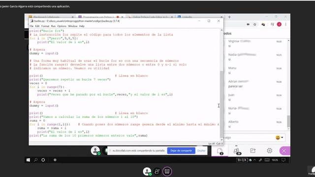 Tras realizar ese ejercicio, García pasa a hablar sobre cómo lograr que sonase música en los primeros años de la programación por ordenador y explica con ejemplos programas para realizar gráficos como una línea recta, una parábola o una onda. Algunos alumnos tienen dificultades para reproducir en casa estos ejercicios y el profesor les pide que compartan sus pantallas para ver los programas que han escrito y solucionar los fallos.