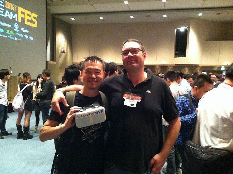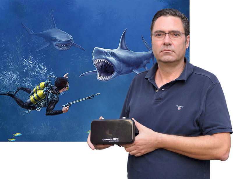 Víctor Ruiz había fundado en 2013 una empresa propia, Lakento. Recuerda que probó en Gamescom unas gafas de cartón (cardboard) de realidad virtual para móviles que había diseñado un español que había presentado el proyecto en un kickstarter y Ruiz y un socio que tenía en Lakento le propusieron financiarle las gafas, pero no hubo acuerdo, así que Ruiz decidió diseñar su propio dispositivo. "Las gafas tipo cardboard son un estereoscopio", explica, ‘dos imágenes que parecen iguales, pero tiene una pequeña separación, la misma que tienen los ojos y la sensación, cuando tú lo ves, es de profundidad. Esa es una parte de la VR, y la otra es que el teléfono, que es lo que metes en la gafa, tiene un giroscopio, con lo cual en qué ángulo está respecto al mundo. Eso es un valor que se puede llamar desde el teléfono y con ese dato calculas hacia dónde está enfocando y hasta te da la velocidad angular al moverse. La teoría de la VR inicial, la de las gafas cardboard de cartón que daba Google, es lo que fabriqué. La diferencia de mis gafas es que tenían dos botones que permitían transmitir al teléfono un control usando el mismo sistema táctil de la pantalla con una goma conductiva. Yo lo usaba para disparar o para avanzar en House of Terror VR". Lakento sacó este juego y Sharks VR para dar apoyo a las gafas patentadas por Ruiz, aunque se podían jugar con cualquier otras gafas de cartón y un joystick bluetooth.