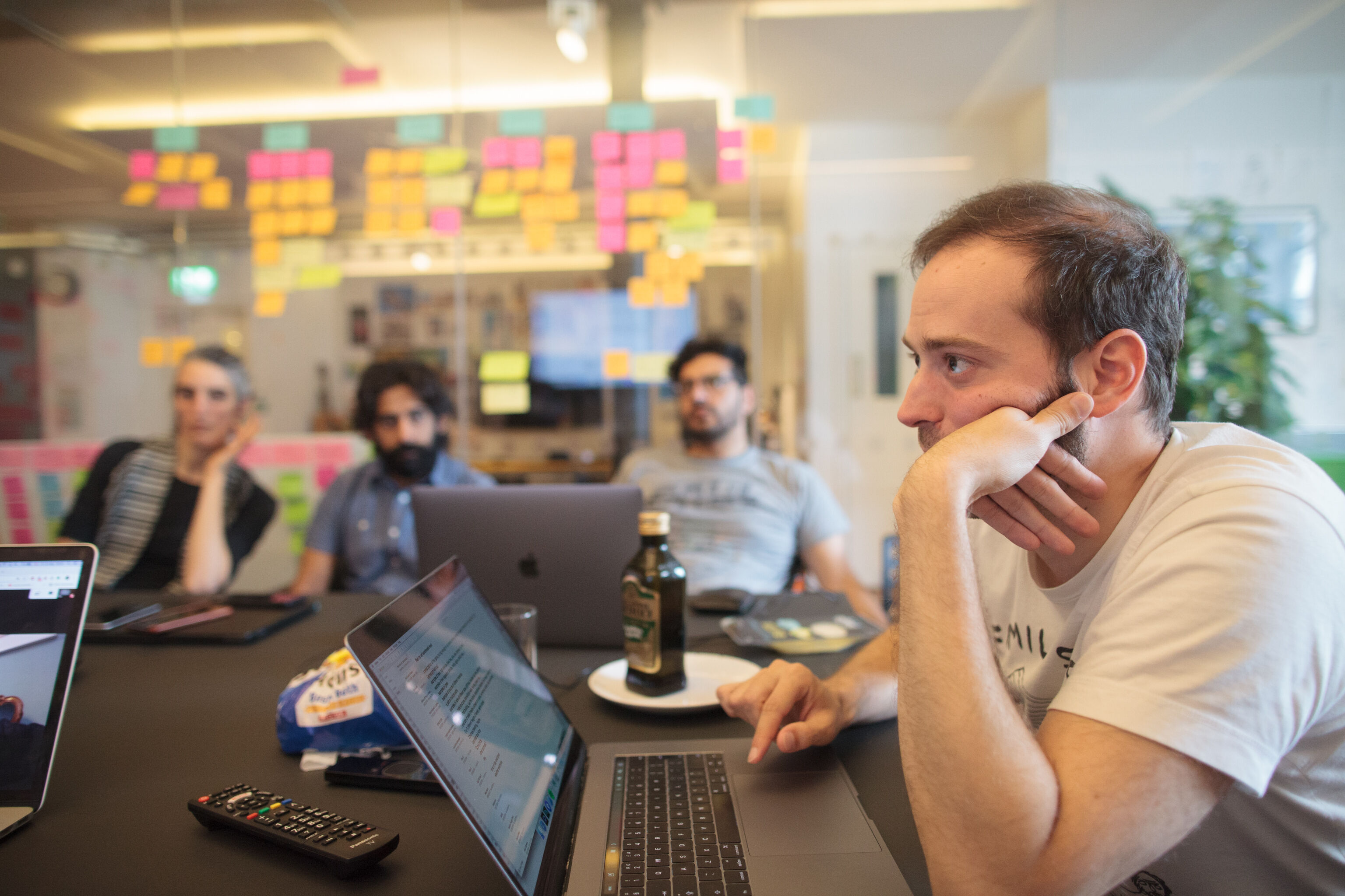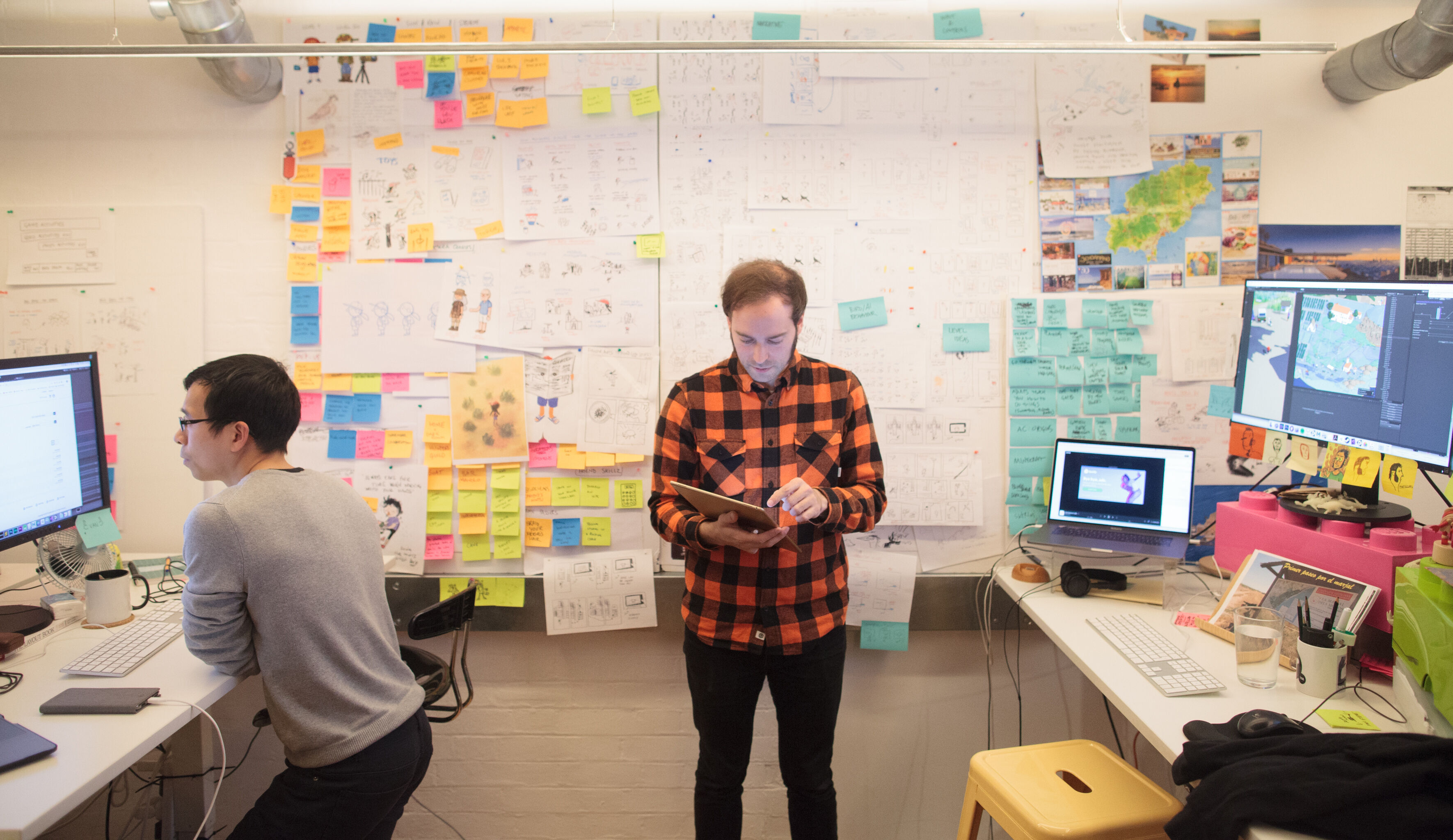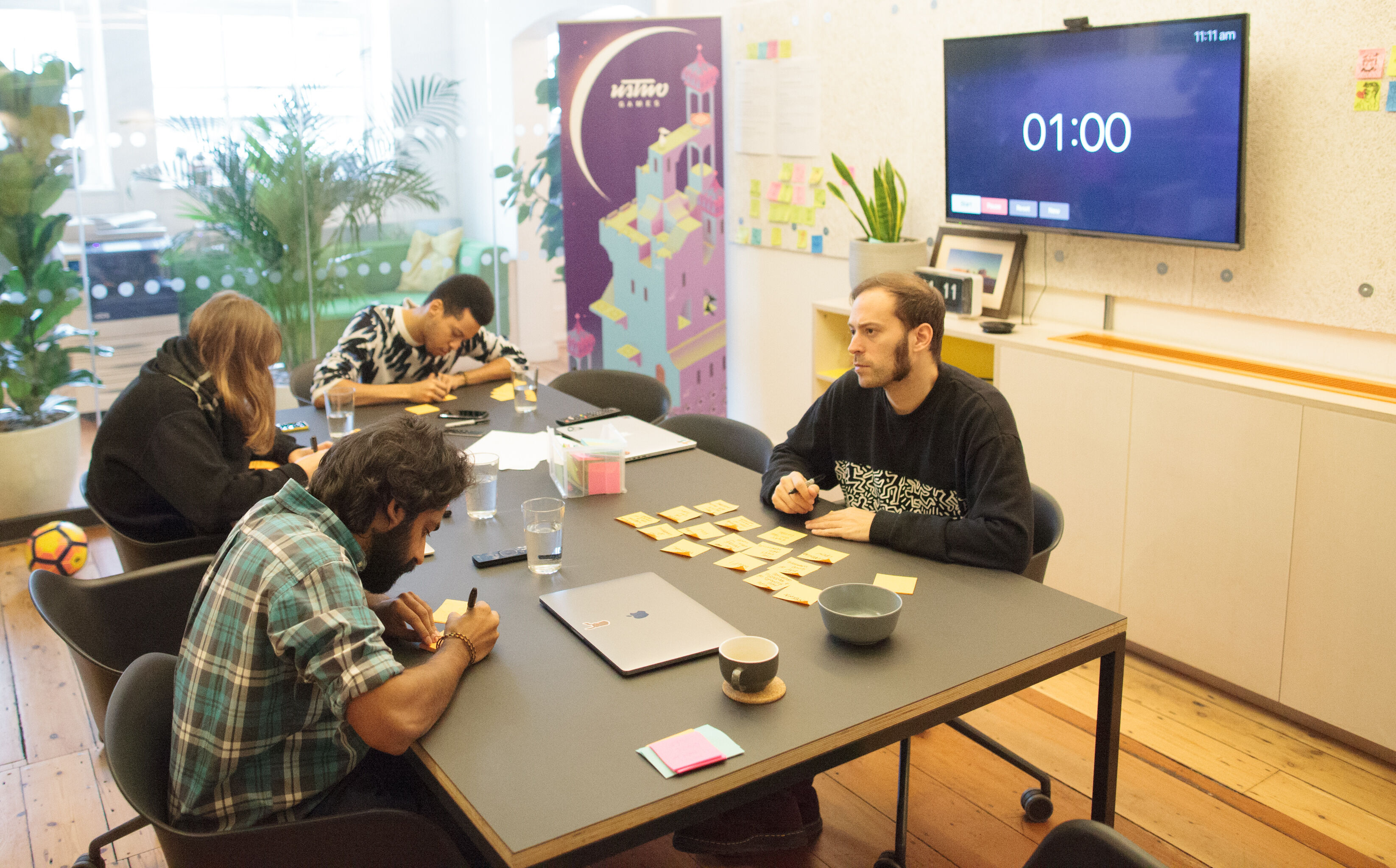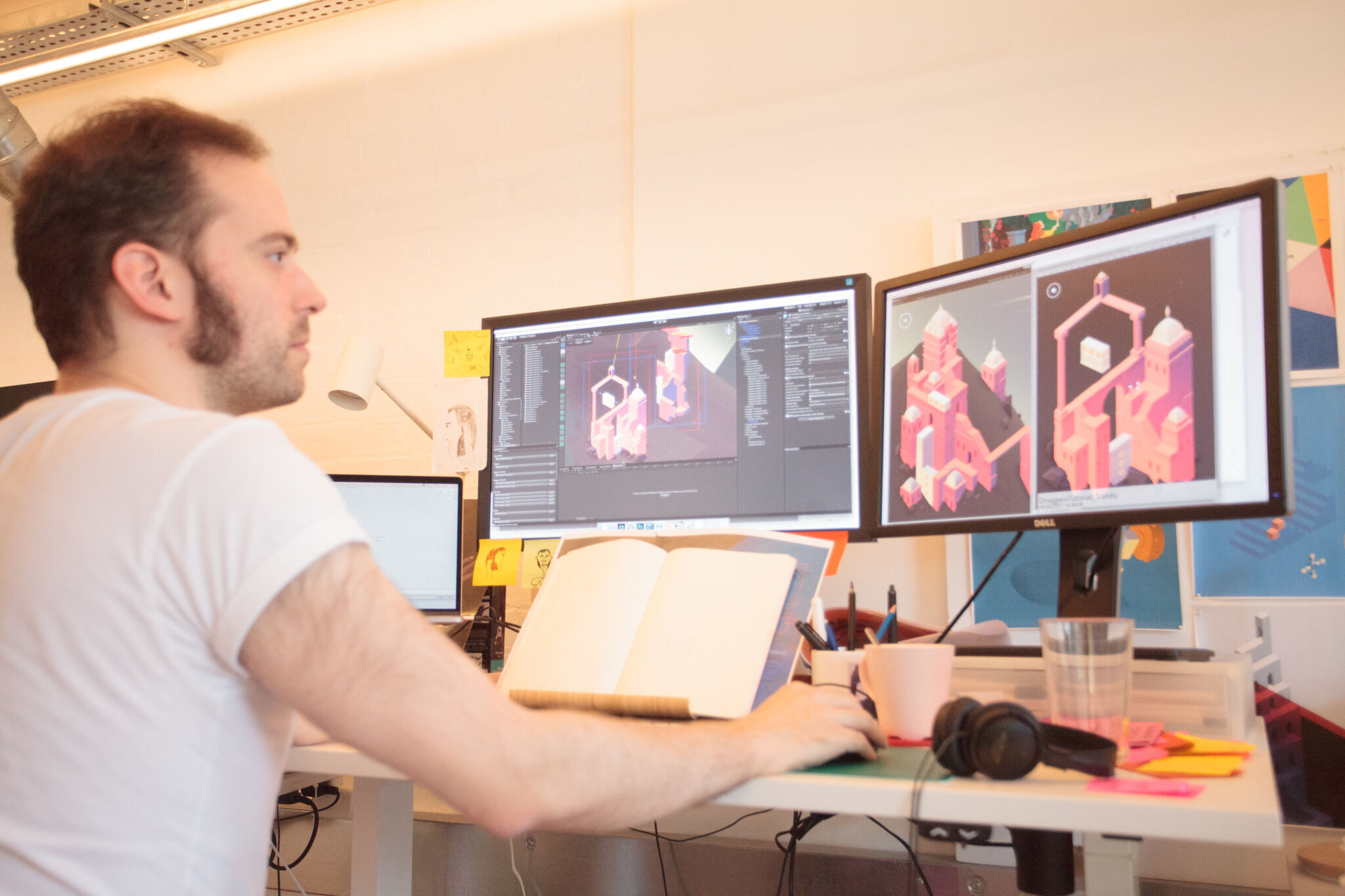 Envió tandas de currículos y la tercera empresa que le entrevistó era Ustwo, que se dedicaba al diseño gráfico realizando webs y apps para grandes empresas, pero ese trabajo es bajo contrato de confidencialidad y Ustwo quería tener trabajo que poder mostrar, para lo que necesitaba producto propio que le sirviera para darse a conocer y conseguir más clientes, de manera que creó un estudio de desarrollo de videojuegos que para entonces había publicado un par de títulos en móviles: Whale Trail, Blip Blup y habían creado también algunas apps que no llegaban a ser videojuego sino juguetes interactivos.