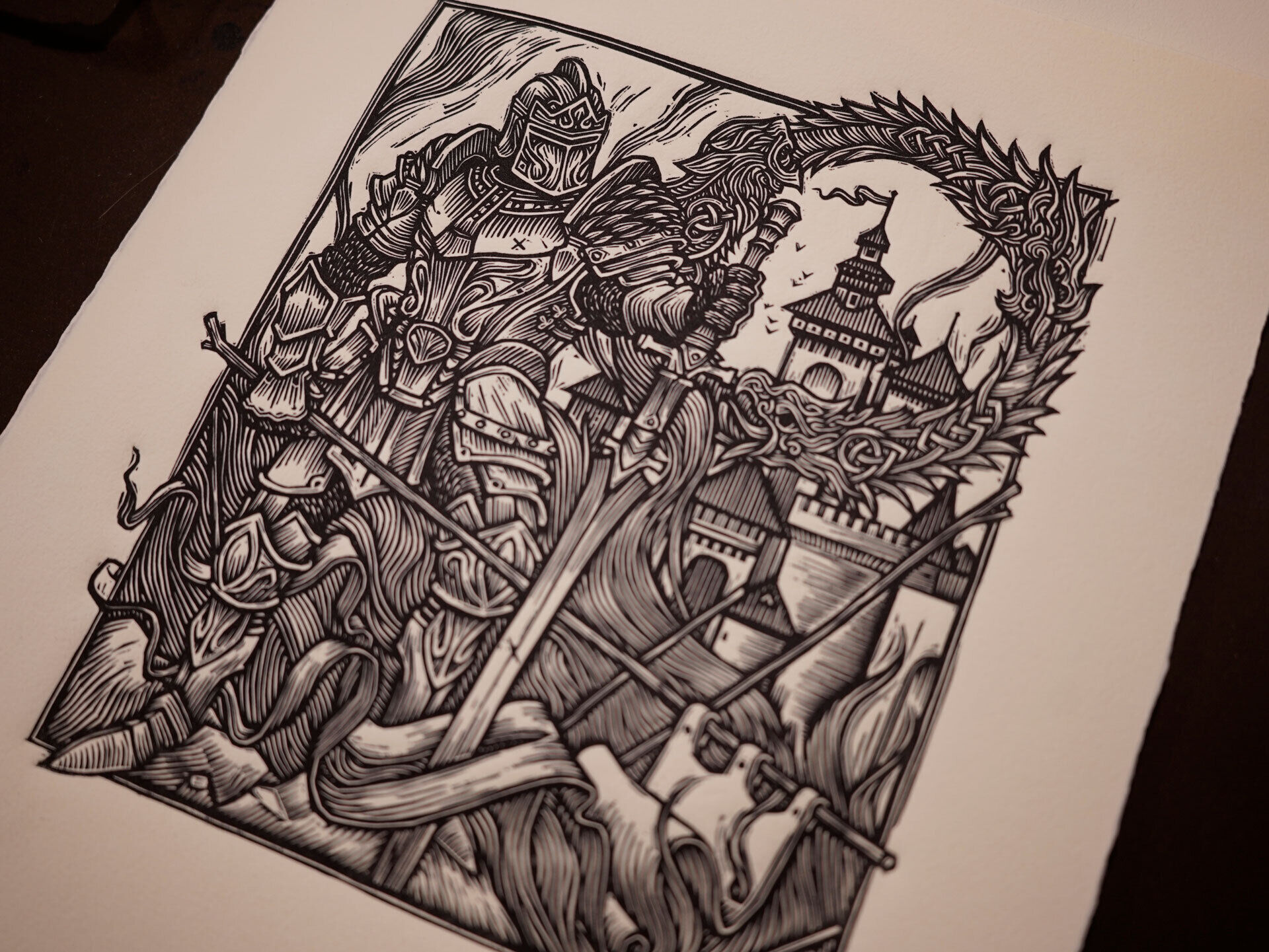 Estos dos cuadros que tengo detrás son el póster que hizo Ricardo Cavolo para lo de Pac-Man, que me parece maravilloso, y una grabado que ha hecho para TESO [The Elder Scrolls Online] Tomás Hijo, que me encanta y cuando lanzamos Hight Isle, el último capítulo, hicimos el grabado con él. Yo soy una friqui de estas cosas y que sea un linograbado me flipa, pero mucha gente no sabe ni cómo está hecho así que fue hacer una tirada exclusiva de muy pocas copias y también un work in progress para que la gente aprecie la técnica. Tenía muchas ganas de hacer algo con él y con TESO pega mogollón, es una pasada verlo, para mí es como ASMR.