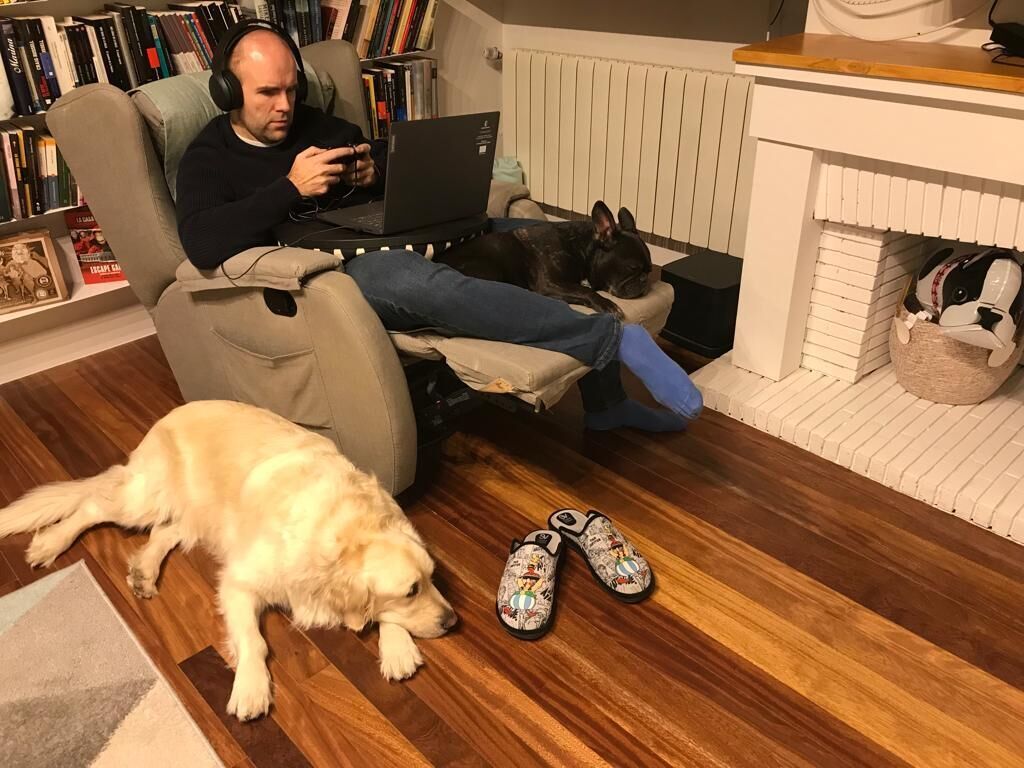 Tengo una anécdota brutal. Hace muy poco he descubierto que si le pongo los auriculares a la Play o la Xbox no necesito encender la tele, entonces me pongo a jugar con la tele apagada, ja, ja, ja. En el colmo del friquismo y de las parejas antisociales del s. XXI descubrimos que, al mismo tiempo, se puede poner Netflix y, en el más difícil todavía, pusimos la Xbox al mismo tiempo. Yo jugaba al Ragnarok en un lado del sofá con los Pulse 3D mientras mi mujer seguía dándole caña al Return to Monkey Island a mi lado y yo le decía: "Marta, que me he atascado" y ella cambiaba de canal, me decía cómo salir y seguía adelante. Lo descubrimos hace dos semanas, antes me sentía muy mal porque cuando jugaba Marta se tenía que ir del salón. Hemos descubierto la forma antisocial y, al mismo tiempo, no exclusiva de no acaparar el salón, que es cada uno con unos auriculares. Vas metiéndote en cosas y vas descubriendo por serendipia pura este tipo de cosillas.