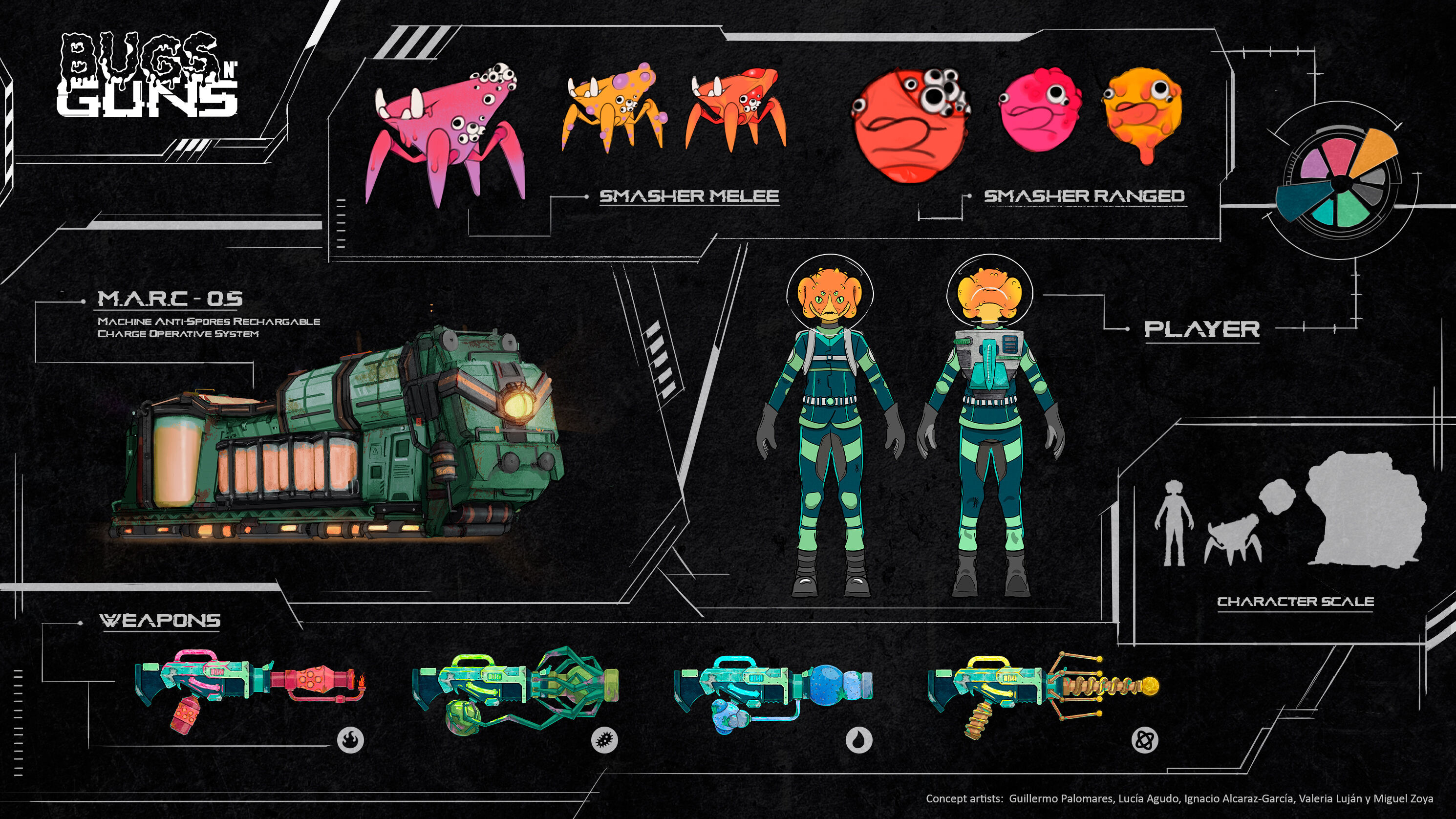 A finales de octubre cada grupo deberá tener listo una demo jugable que será su TFM, es el método U-tad, en el que los alumnos tienen el control creativo total sobre su juego y cuentan con el asesoramiento de una productora académica y de los profesores del máster para que al salir al mercado laboral sepan cómo trabajar en equipo e integrarse en un estudio de desarrollo de videojuegos. En el caso de Bugs N' Guns, la productora académica, Belén Gómez, dice: "en el momento en que lo ves ya quieres empezar a moverte, implicarte y, si consiguen esa cooperatividad online va a ser un juego muy potente".