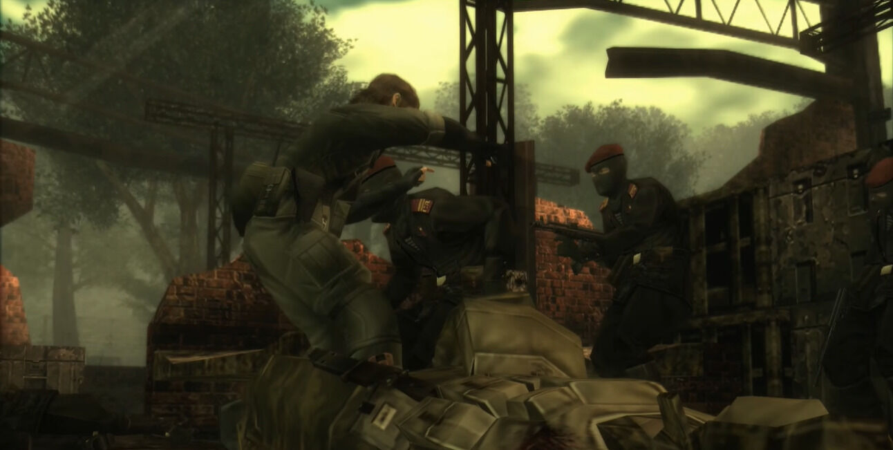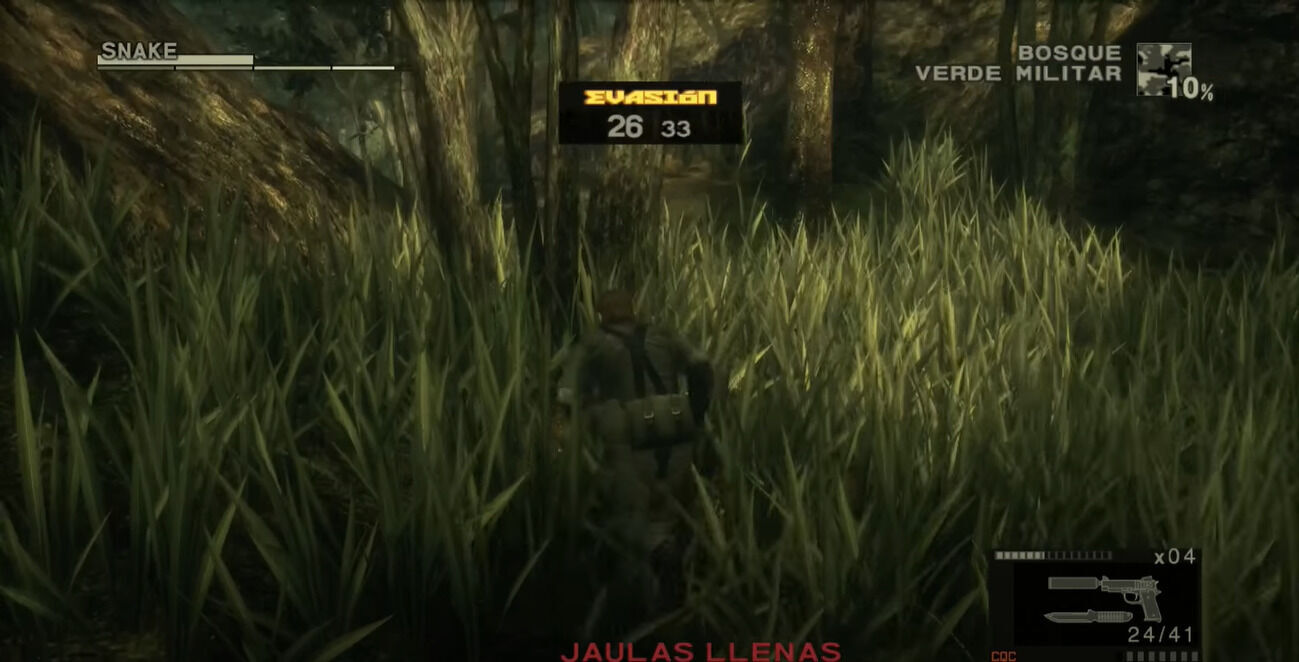 El escenario también fue uno de los puntos que marcaron la diferencia, y aun a día de hoy, si echamos un repaso a la saga, sigue siendo uno de los elementos que más puntos hace ganar a Snake Eater. La historia de esta entrega nos traslada al año 1964, en plena Guerra Fría, y nos suelta en las selvas de Tselinoyarsk en la Unión Soviética. Desde el mismo instante en el que pisamos el suelo como Naked Snake, cualquier cosa es hostil: serpientes, insectos, soldados... La selva era una enemigo más y su lema era sencillo: adaptarse o morir. Ya no solo teníamos que preocuparnos de no ser detectados por enemigos armados, también había que ir con cuidado con los animales (esos dichosos cocodrilos) y hasta con el entorno, porque un paso mal dado podía enviarnos de vuelta al menú con el clásico: "Snake? Snake!? Snaaake!".