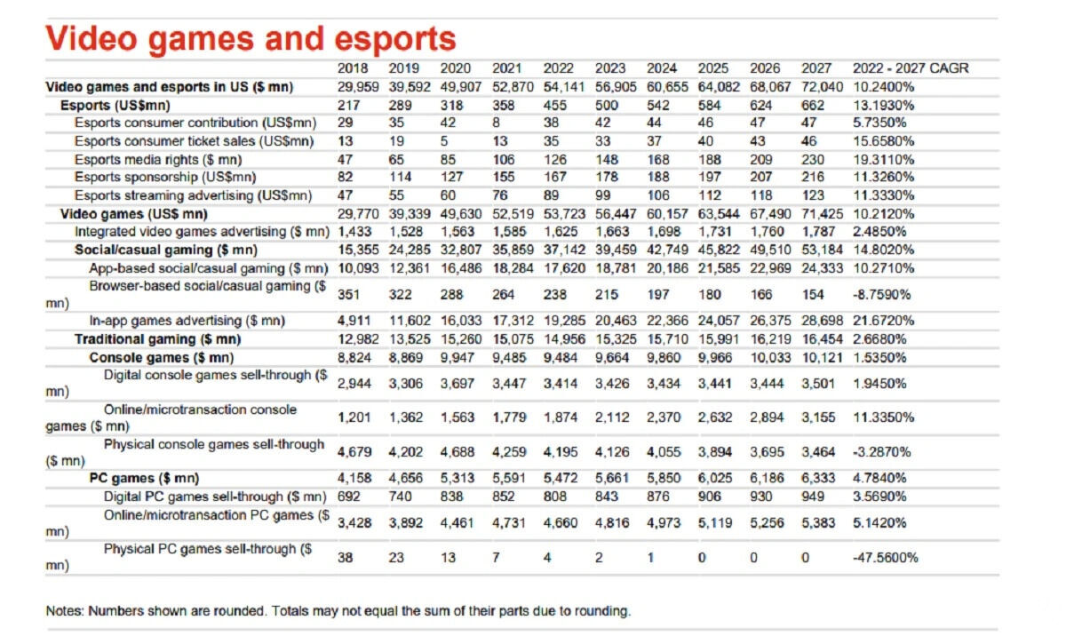 Mientras el mercado de juegos sociales crece (y esta firma apunta a que lo seguirá haciendo hasta alcanzar el 74 % en 2027), los videojuegos tradicionales han ingresado un 0,8 % menos que en años anteriores. De cara a 2027, se espera que el videojuego tradicional signifique un 22,8 % de la industria estadounidense dentro de cuatro años. Es decir, parece que la tendencia es que este tipo de juegos vayan ingresando cada vez menos, aunque de una manera muy lenta.