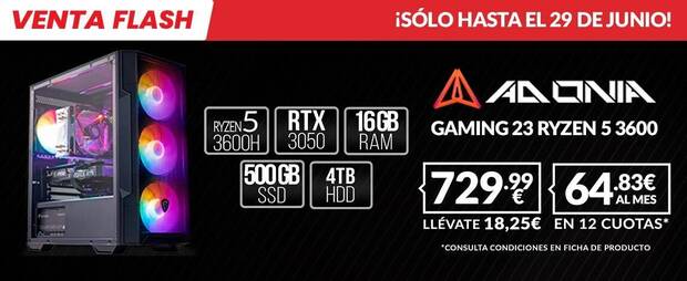 Se trata del PC ADONIA GAMING 23 que "ha sido diseñado para jugar y disfrutar sin problema de tus juegos favoritos" y que solo cuesta 729,99 € gracias a una rebaja por tiempo limitado que durará hasta el 29 de junio o hasta que las existencias de este PC se agoten y si quieres hacerte con este PC puedes conseguirlo haciendo clic en este enlace.