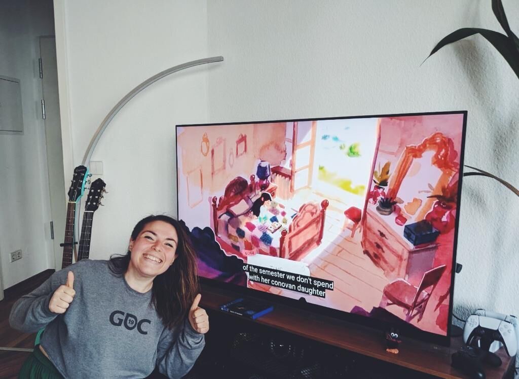 Díez comenzó el máster, "sobre todo me acuerdo mucho de mi tutora del Trabajo de Fin de Máster [TFM], Thaleia Deniozou, que siempre me apoyó muchísimo", recuerda. A mitad de curso le concedieron una beca de IGDA Foundation Velocity para asistir a la GDC en San Francisco. Esto suponía dejar el máster durante unos 10 días para asistir a la feria americana y Deniozou le ayudó a gestionar los permisos necesarios para aprovechar la oportunidad.