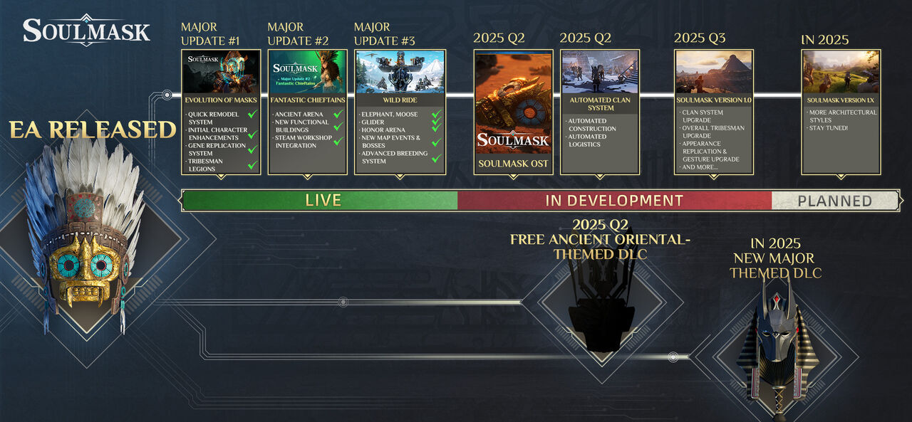 El equipo también ha prometido ofrecer más detalles a lo largo del año para preparar a la comunidad ante lo que será un hito clave en la evolución del juego. Más adelante, Soulmask seguirá ampliándose con nuevos estilos arquitectónicos para la construcción y otras mejoras que todavía no han sido detalladas.