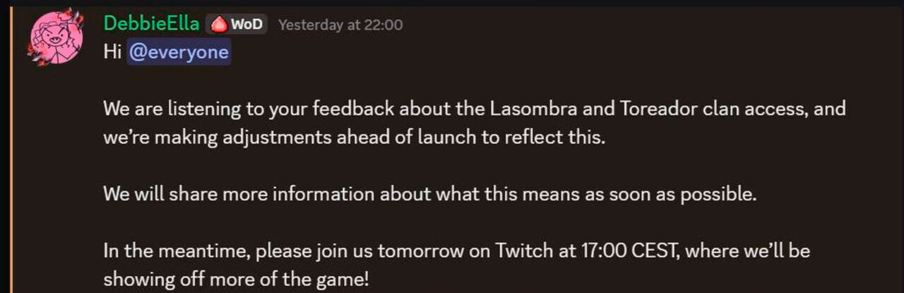 La presión ha llegado a oídos de los responsables, y en el Discord de Bloodlines 2 la desarrolladora de comunidad de World of Darkness ha comentado que escuchan las reacciones sobre el acceso a los clanes Lasombra y Toreador, y que están "haciendo ajustes antes del lanzamiento" en respuesta a estos comentarios.
