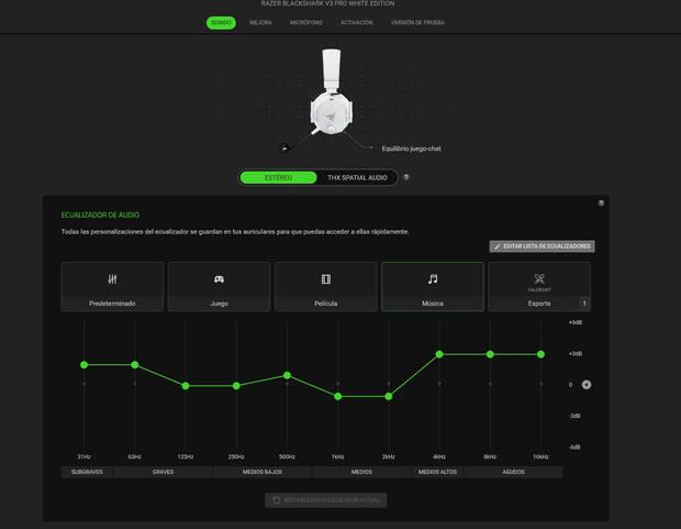 Para exprimir todo el potencial y ajustar la experiencia a nuestro gusto, es casi obligatorio pasar por su centro de control de software, Razer Synapse, el programa de Razer para controlar sus dispositivos, que nos permite acceder a un ecualizador gráfico para afinar la firma de sonido, hasta activar y personalizar al detalle el audio espacial THX Spatial Audio, pasando por todo tipo de ajustes y perfiles que podemos cambiar al vuelo pulsando un solo botón. Todo ello se presenta, como es costumbre en la marca, en una interfaz visualmente limpia y sorprendentemente intuitiva para la cantidad de parámetros que maneja.