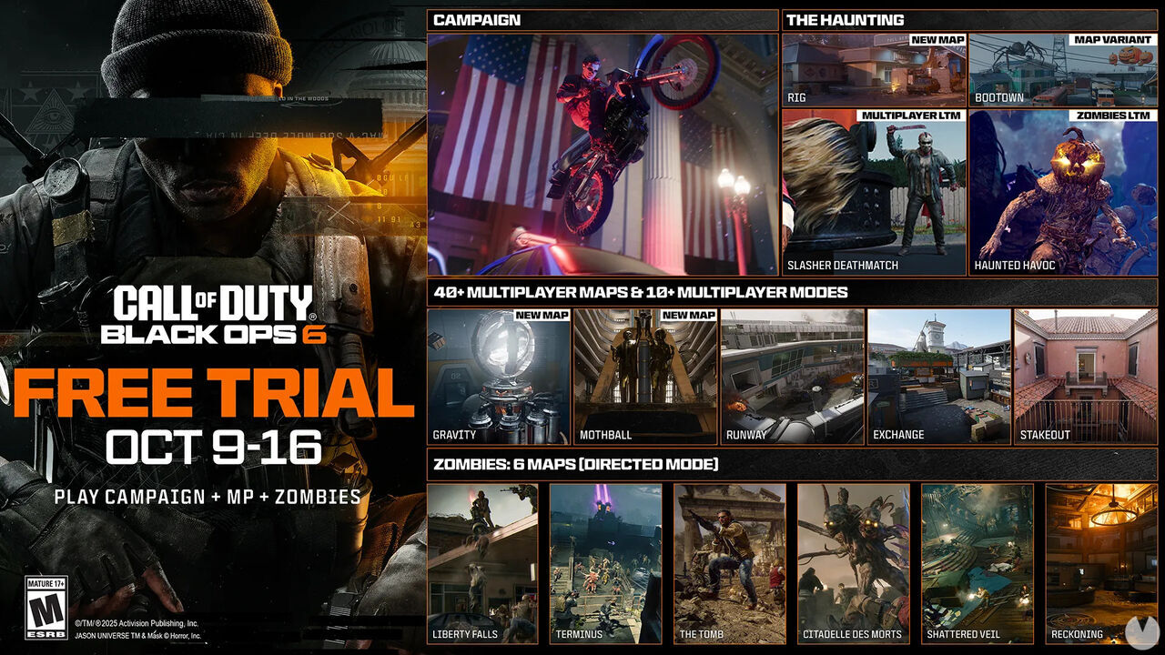 Además del multijugador y el modo zombis (excluyendo el juego clasificatorio), por primera vez esta prueba gratuita incluye su campaña. En total hay más de 40 mapas del multijugador, los seis mapas de Zombis y mucho más. En la siguiente imagen podéis encontrar todo lo que incluye.
