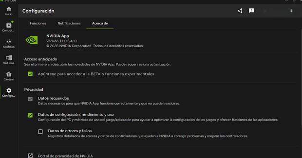 - Activa la Beta: En la NVIDIA App, ve a Ajustes > Acerca de y marca la casilla para participar en la beta.