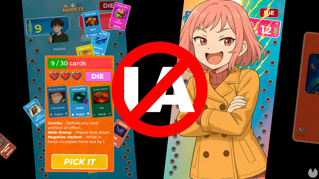 Hardest es un juego de cartas roguelike gratuito estilo "piedra, papel y tijera" estrenado el pasado julio. Como otros tantos títulos de Steam en la actualidad, se indica que ha utilizado IA generativa para las ilustraciones, y esto no sería noticia sino fuese porque su creador ha anunciado que lo retirará de Steam el 30 de enero porque "la IA es mala".