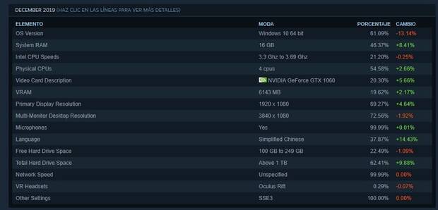 Otros detalles interesantes son los jugadores con equipos con 16 GB de RAM que representan según esta encuesta el 46,37% de los jugadores así como un aumento de la resolución 1080p que sube hasta el 69,27%. Los dispositivos de realidad virtual siguen siendo minoritarios y en Windows vemos de nuevo un dato curioso, una subida del 14,57% en el uso de Windows 7 que coincide casi en su totalidad con el aumento del idioma chino por lo que nos da, de nuevo, otra pista de que esta encuesta no es demasiado realista probablemente debido a que muchos de los encuestados en china usan un equipo similar en los distintos cibercafés.