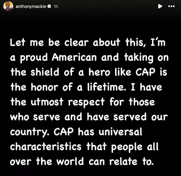Ante la controversia, Mackie recurrió a su cuenta de Instagram para aclarar sus comentarios y reafirmar su postura. “Quiero ser claro sobre esto: soy un estadounidense orgulloso”, escribió en sus historias. “Tomar el escudo de un héroe como el Capitán América es el honor de una vida. Tengo el máximo respeto por quienes sirven y han servido a nuestro país”. Además, explicó que su intención nunca fue menospreciar la identidad del personaje, sino destacar que los valores que representa van más allá de una nación: “Cap tiene características universales con las que la gente de todo el mundo puede identificarse”.