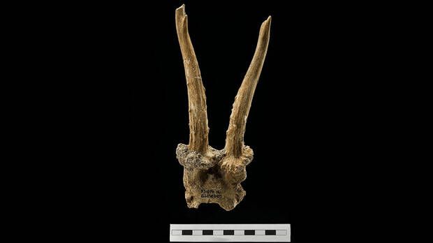 Lo que vuelve extraña a la pieza no es solo el material, sino el trabajo que presenta. El hueso conserva un recorte rectangular en la bóveda craneal, marcas compatibles con el desollado y muescas laterales junto a la base de la cornamenta, rasgos que los investigadores interpretan como señales de manipulación deliberada para llevarlo en la cabeza, probablemente sujeto mediante algún sistema de amarre. No parece, por tanto, un simple resto de caza ni un desecho casual, sino un objeto transformado para un uso muy concreto.