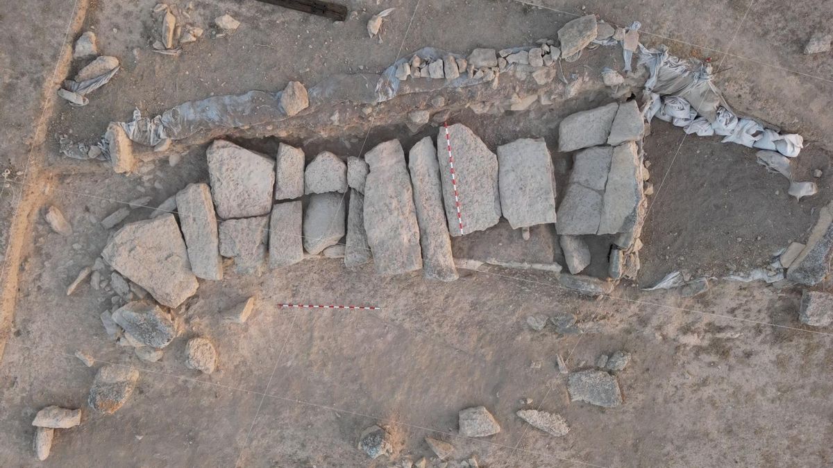 La estructura está formada por grandes losas de piedra verticales, cubiertas a su vez por bloques horizontales que, en origen, quedaron enterrados bajo un túmulo artificial de arena y piedras. En su interior, los arqueólogos localizaron compartimentos con varios osarios y un ajuar funerario que sorprende tanto por su riqueza como por su procedencia. Entre los objetos destacan piezas de marfil, ámbar y conchas marinas, materiales considerados de prestigio en la época y que sugieren la existencia de redes de intercambio a larga distancia.