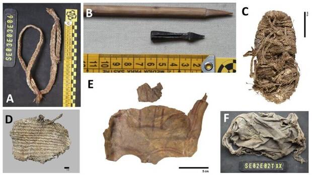 Entre los objetos más antiguos se halló una sandalia completa de esparto trenzado, datada mediante carbono 14 en el siglo XIV, así como un fragmento de cuero ovino decorado, contemporáneo del mismo periodo. En el mismo yacimiento aparecieron una punta de ballesta, un trozo de honda de fibras vegetales, un fragmento de cesto de mimbre de 151 años y cordajes de esparto utilizados para el calzado o el transporte. Los investigadores sugieren que estos materiales proceden de los entornos rurales y pastoriles medievales de la región, donde los humanos compartían territorio con estas rapaces carroñeras.