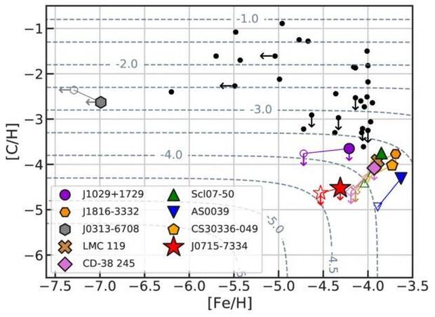 El análisis de su luz —publicado en arXiv y pendiente de revisión por pares— muestra una escasez asombrosa de elementos como el hierro, el magnesio y especialmente el carbono. Esa composición sugiere que SDSS J0715-7334 nació a partir de los restos de una estrella madre de unas 30 masas solares, que explotó como supernova hace más de 13.000 millones de años.
